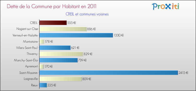 Par rapport aux 35 008 habitants de Creil, en 2011 le poids de cette dette représente 555 € par habitant.