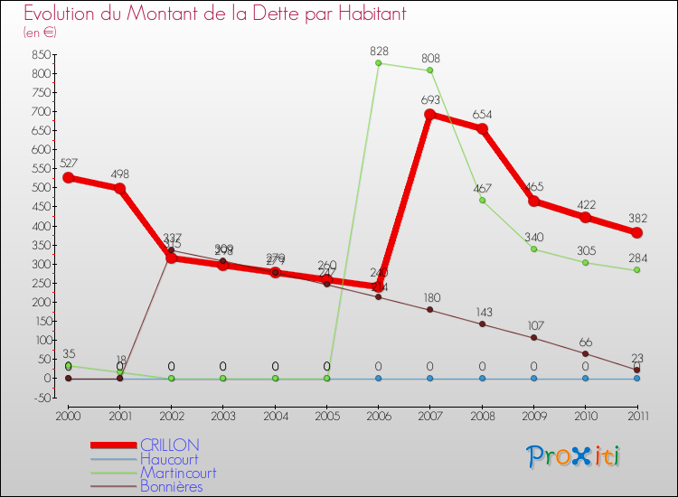 Pendant la même période, les communes françaises similaires à Crillon, ont vu leur dette par habitant augmenter de 41.73 % en moyenne entre 2000 et 2011.