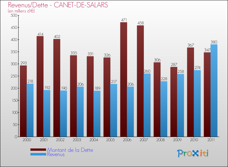 Comparaison de la dette et des revenus pour CANET-DE-SALARS de 2000 à 2011