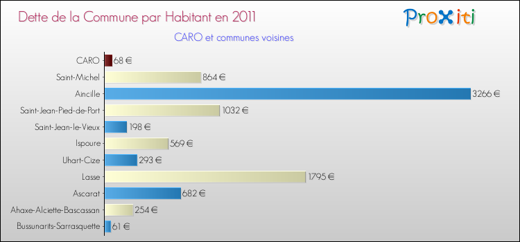 A Caro, la dette due par habitant de la commune en 2011 est donc moins élevée de 86.53 % que pour des communes similaires.