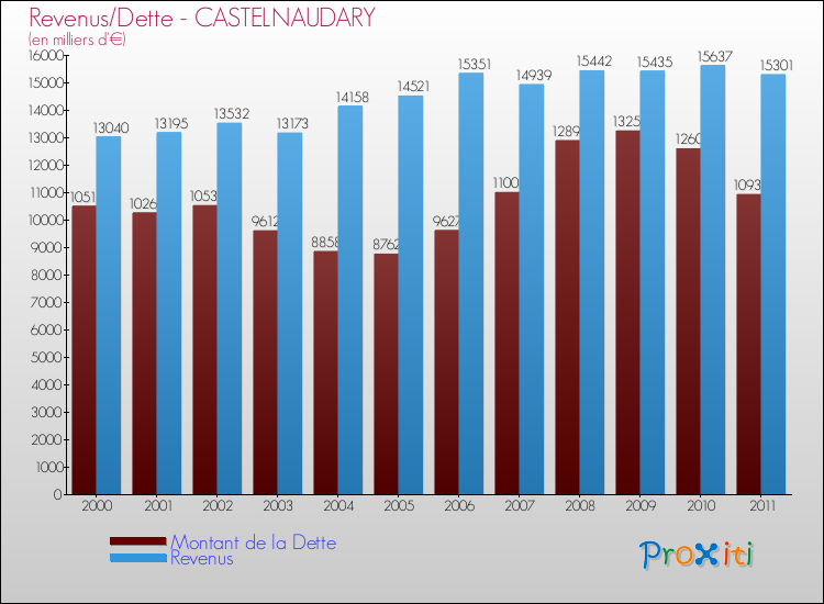 Comparaison de la dette et des revenus pour CASTELNAUDARY de 2000 à 2011