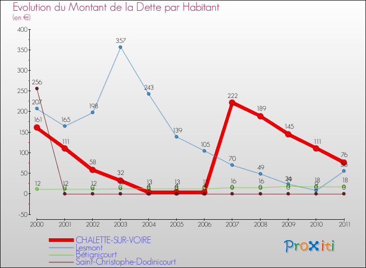 Pendant la même période, les communes françaises similaires à Chalette-sur-Voire, ont vu leur dette par habitant augmenter de 24.08 % en moyenne entre 2000 et 2011.