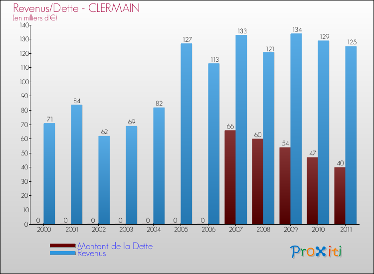 Comparaison Revenus/Dette de Clermain (de 2000 à 2011)