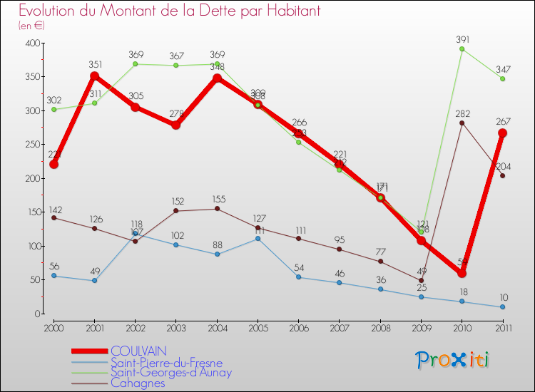 Par rapport aux 350 habitants de Coulvain, en 2011 le poids de cette dette représente 267 € par habitant.