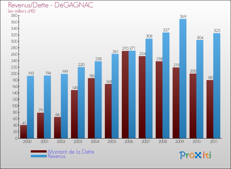 Comparaison Revenus/Dette de Dégagnac (de 2000 à 2011)