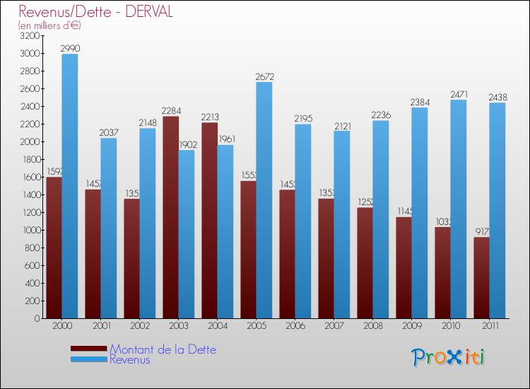 Comparaison Revenus/Dette de Derval (de 2000 à 2011)