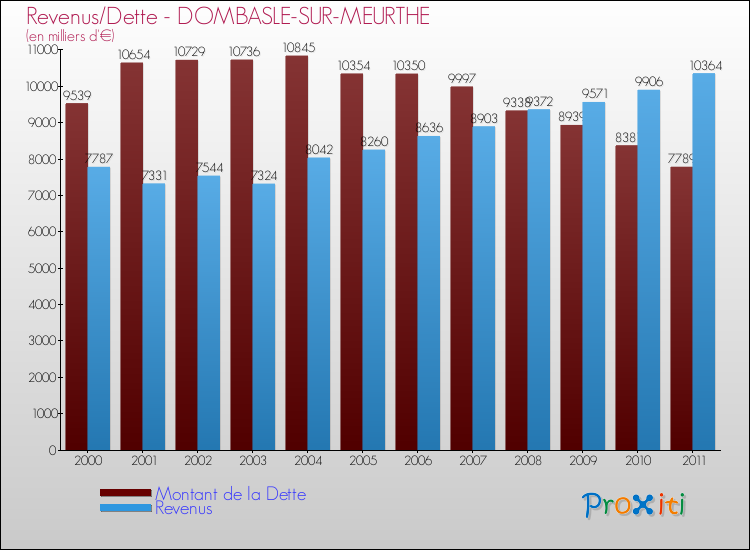 Comparaison Revenus/Dette de Dombasle-sur-Meurthe (de 2000 à 2011)