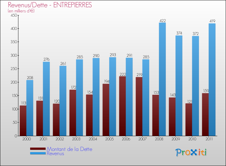 Comparaison Revenus/Dette de Entrepierres (de 2000 à 2011)