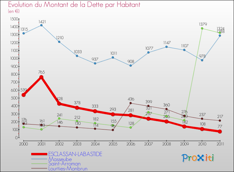 A Esclassan-Labastide, la dette par habitant a donc baissé de 85.71 % entre 2000 et 2011.