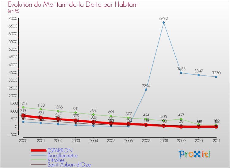 A Esparron, la dette par habitant a donc baissé de 100 % entre 2000 et 2011.