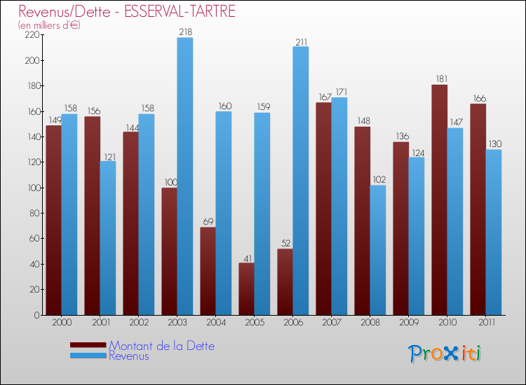 Comparaison Revenus/Dette de Esserval-Tartre (de 2000 à 2011)