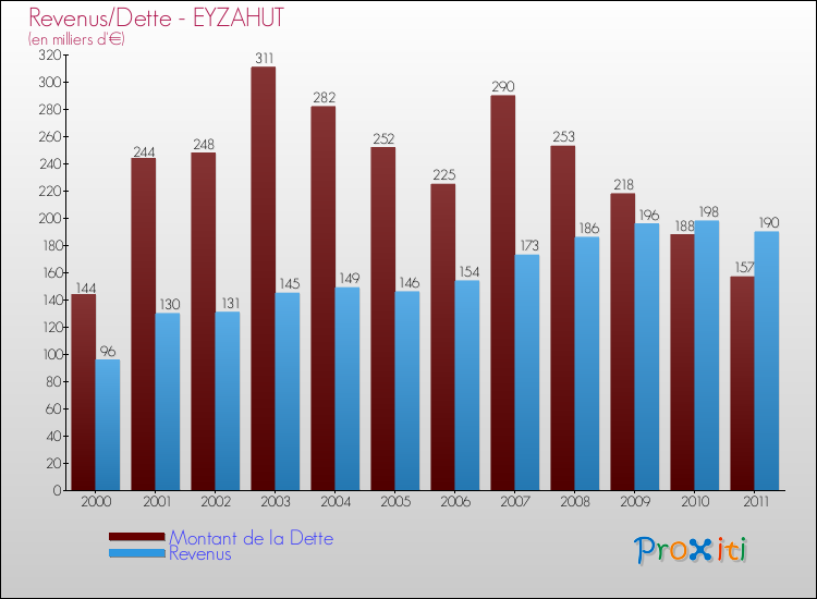 Comparaison Revenus/Dette de Eyzahut (de 2000 à 2011)