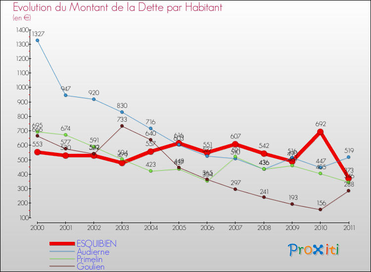 Par rapport aux 1 646 habitants de Esquibien, en 2011 le poids de cette dette représente 373 € par habitant.