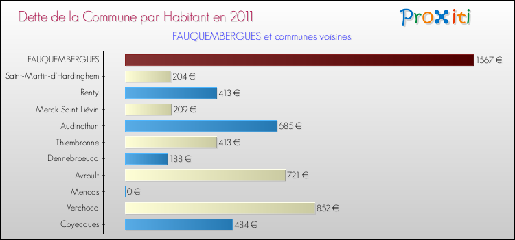 A Fauquembergues, la dette due par habitant de la commune en 2011 est donc plus élevée de 143.32 % que pour des communes similaires.