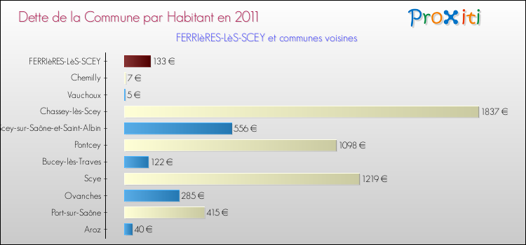 A Ferrières-lès-Scey, la dette due par habitant de la commune en 2011 est donc moins élevée de 73.66 % que pour des communes similaires.