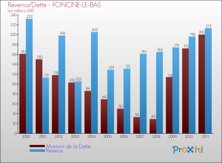 Comparaison Revenus/Dette de Foncine-le-Bas (de 2000 à 2011)