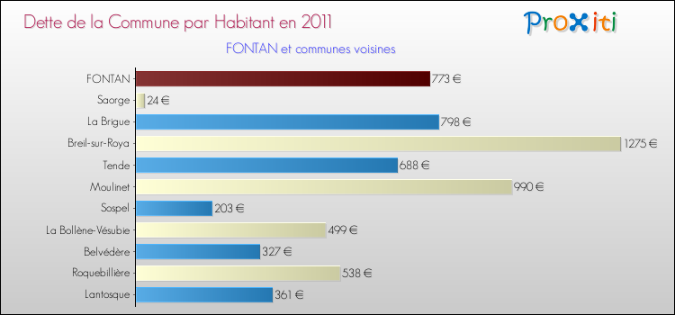 A Fontan, la dette due par habitant de la commune en 2011 est donc plus élevée de 81.46 % que pour des communes similaires.
