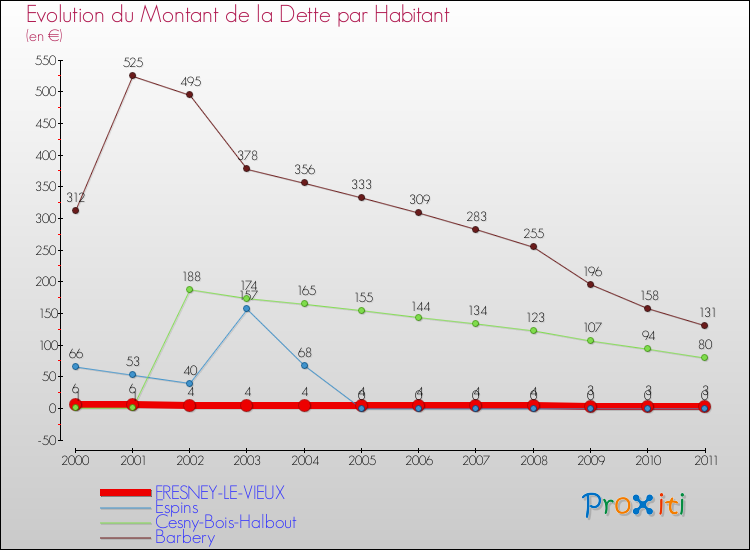 A Fresney-le-Vieux, ce montant de la dette est le même que pour 2010.