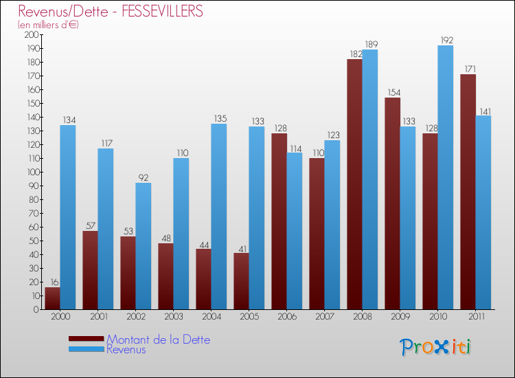 A Fessevillers, ce montant de la dette est en augmentation de 33.59 % par rapport à 2010.