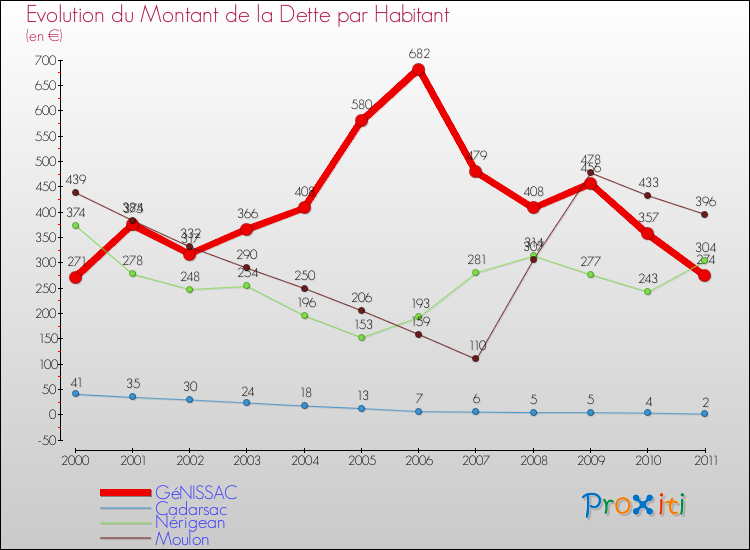 A Génissac, la dette par habitant a donc augmenté de 1.11 % entre 2000 et 2011.