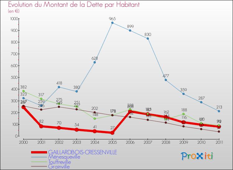 Pendant la même période, les communes françaises similaires à Gaillardbois-Cressenville, ont vu leur dette par habitant baisser de 2.96 % en moyenne entre 2000 et 2011.