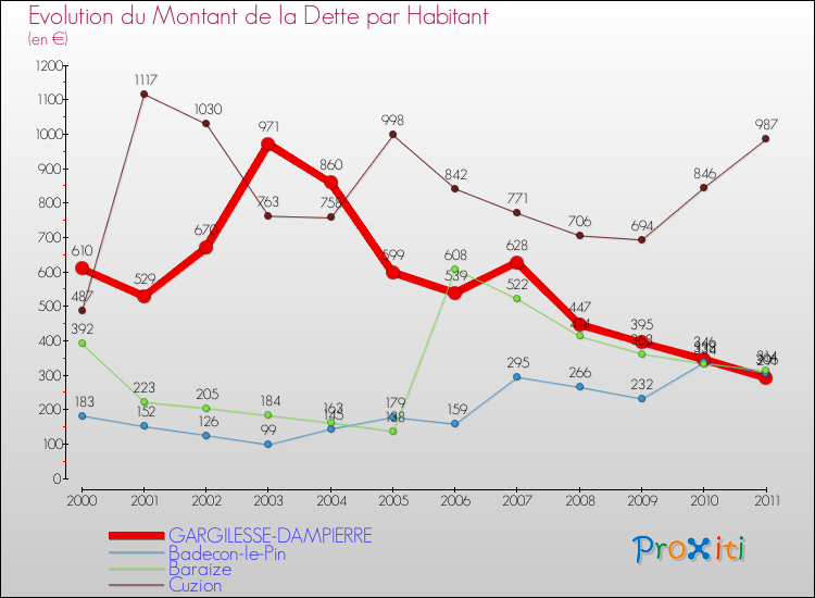 A Gargilesse-Dampierre, la dette par habitant a donc baissé de 52.3 % entre 2000 et 2011.