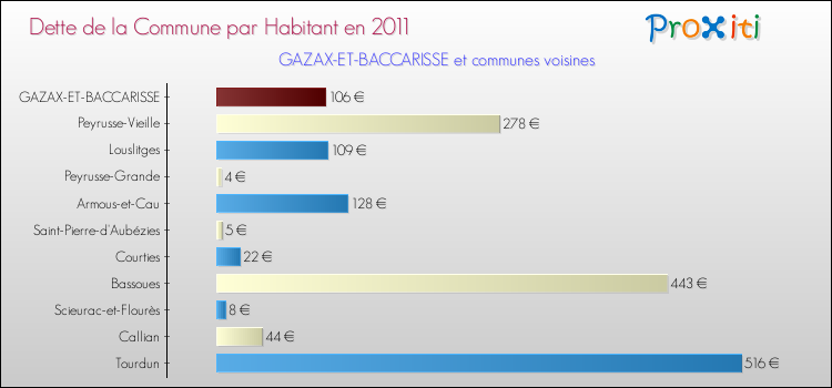A noter : la valeur moyenne de la dette par habitant des communes françaises similaires à Gazax-et-Baccarisse était de 503 € par habitant, en 2011.