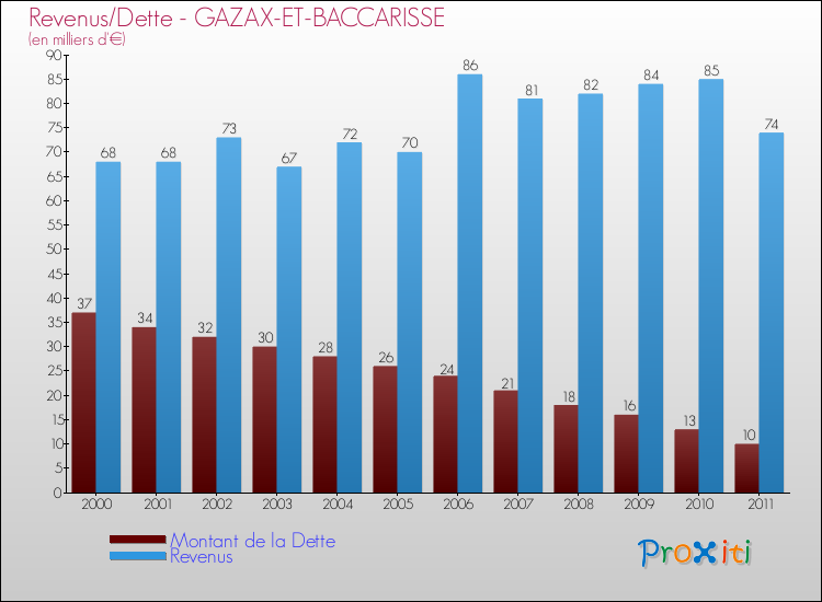 Comparaison Revenus/Dette de Gazax-et-Baccarisse (de 2000 à 2011)