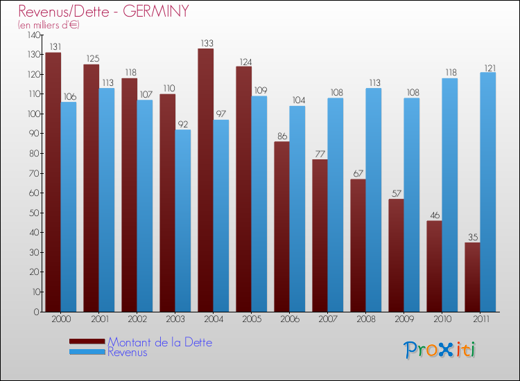 Comparaison Revenus/Dette de Germiny (de 2000 à 2011)