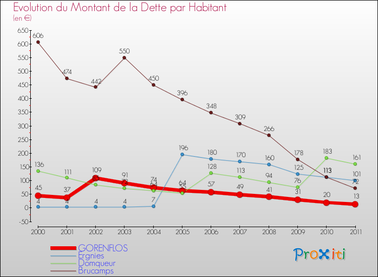 Par rapport aux 254 habitants de Gorenflos, en 2011 le poids de cette dette représente 13 € par habitant.