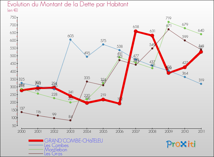 A Grand'Combe-Châteleu, ce montant de la dette est en augmentation de 24.03 % par rapport à 2010.