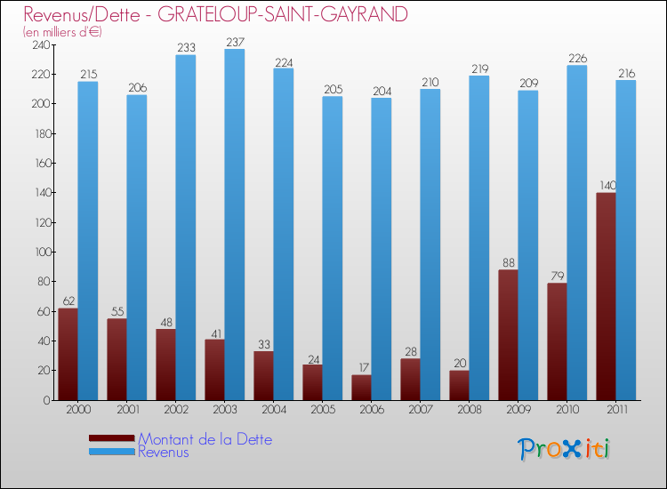 Comparaison Revenus/Dette de Grateloup-Saint-Gayrand (de 2000 à 2011)