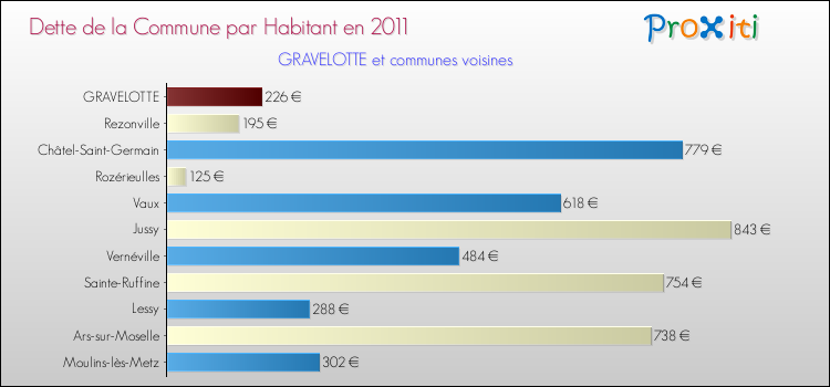 A noter : la valeur moyenne de la dette par habitant des communes françaises similaires à Gravelotte était de 592 € par habitant, en 2011.