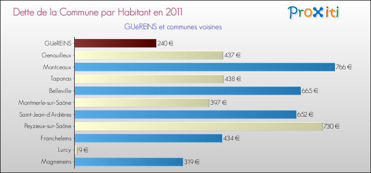 Par rapport aux 1 266 habitants de Guéreins, en 2011 le poids de cette dette représente 240 € par habitant.