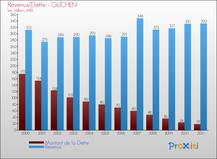 Comparaison Revenus/Dette de Guchen (de 2000 à 2011)