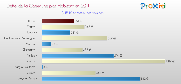 A Gueux, la dette due par habitant de la commune en 2011 est donc moins élevée de 59.47 % que pour des communes similaires.