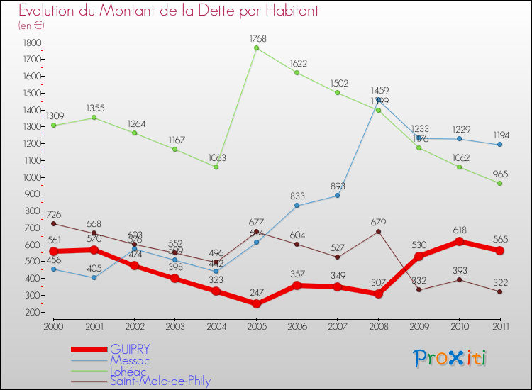 Par rapport aux 3 583 habitants de Guipry, en 2011 le poids de cette dette représente 565 € par habitant.