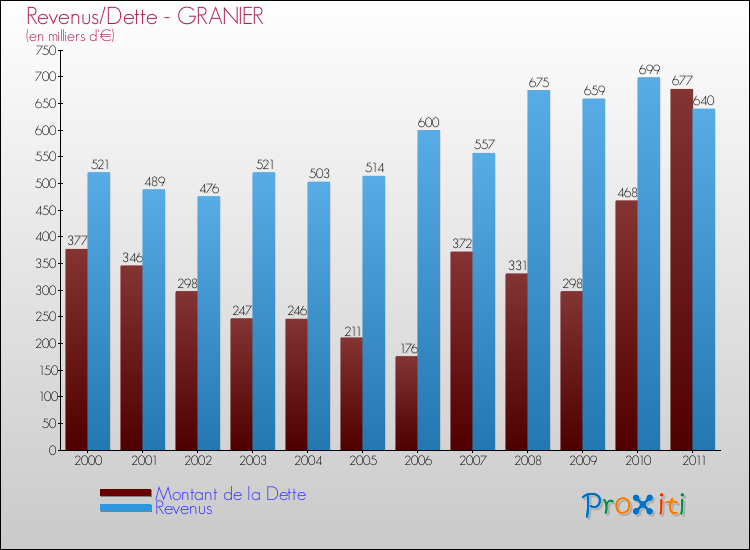 En 2011, le montant total des dettes dûes par la commune de Granier était de : 677 000 €.