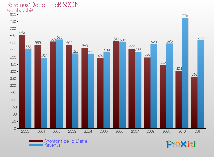 Comparaison Revenus/Dette de Hérisson (de 2000 à 2011)