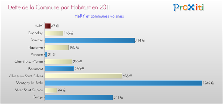 A noter : la valeur moyenne de la dette par habitant des communes françaises similaires à Héry était de 934 € par habitant, en 2011.