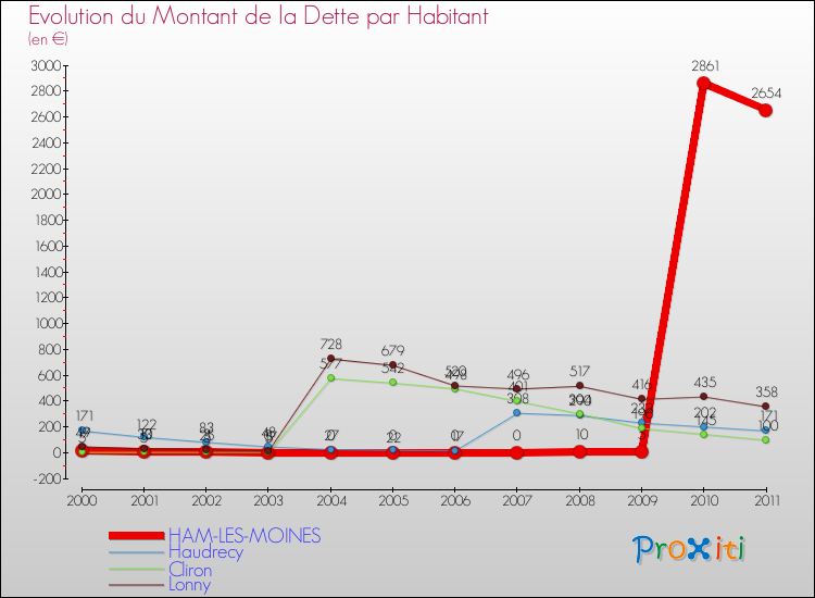Pendant la même période, les communes françaises similaires à Ham-les-Moines, ont vu leur dette par habitant augmenter de 19.13 % en moyenne entre 2000 et 2011.
