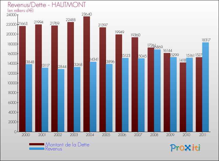 Comparaison Revenus/Dette de Hautmont (de 2000 à 2011)