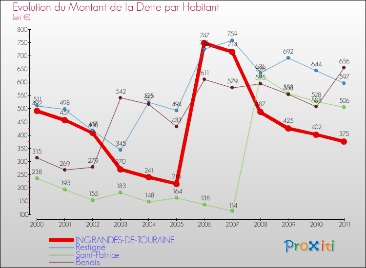 A noter : la valeur moyenne de la dette par habitant des communes françaises similaires à Ingrandes-de-Touraine était de 592 € par habitant, en 2011.