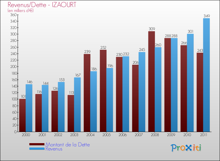 Comparaison de la dette et des revenus pour IZAOURT de 2000 à 2011