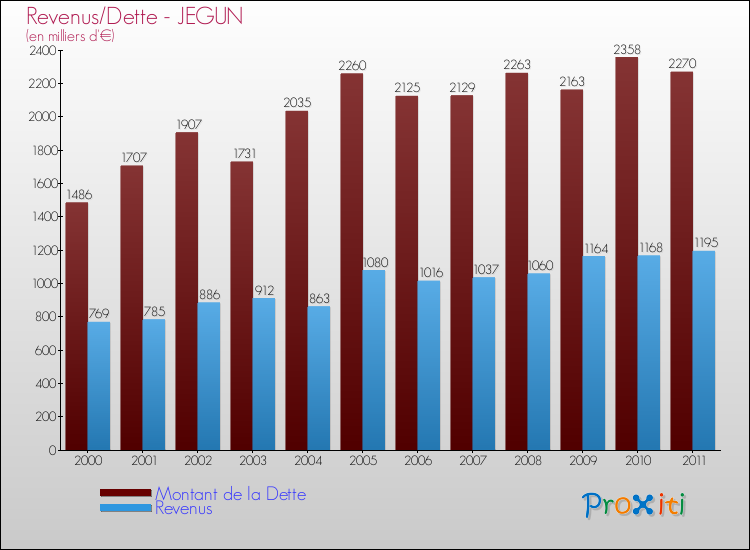 Comparaison Revenus/Dette de Jegun (de 2000 à 2011)