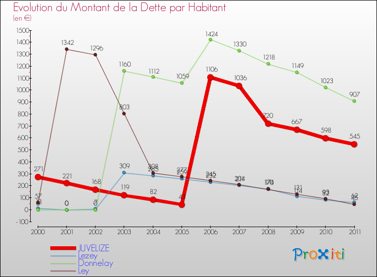 A Juvelize, la dette par habitant a donc augmenté de 101.11 % entre 2000 et 2011.