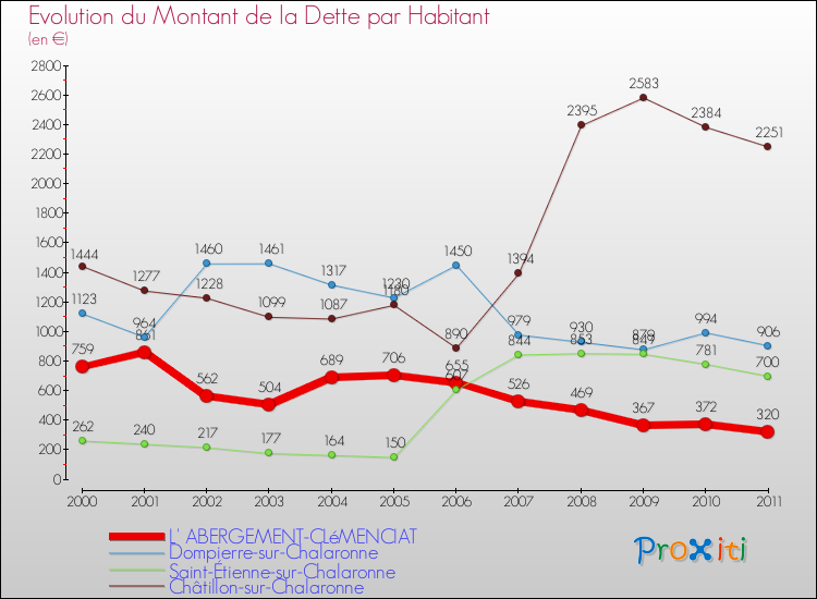 Par rapport aux 807 habitants de L' Abergement-Clémenciat, en 2011 le poids de cette dette représente 320 € par habitant.
