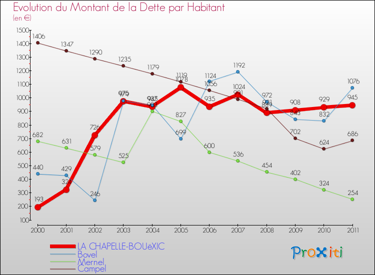 Par rapport aux 1 174 habitants de La Chapelle-Bouëxic, en 2011 le poids de cette dette représente 945 € par habitant.