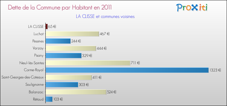 A La Clisse, la dette due par habitant de la commune en 2011 est donc moins élevée de 89.02 % que pour des communes similaires.
