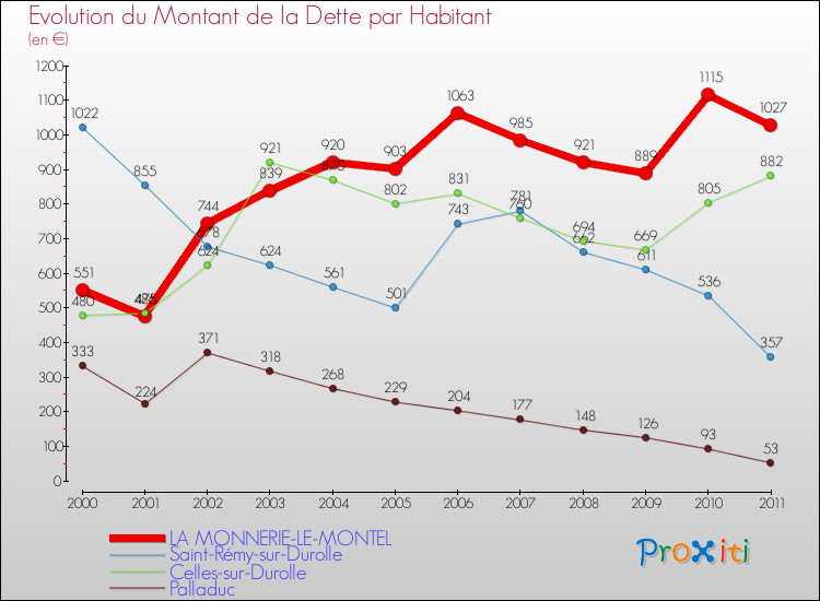 A La Monnerie-le-Montel, la dette par habitant a donc augmenté de 86.39 % entre 2000 et 2011.